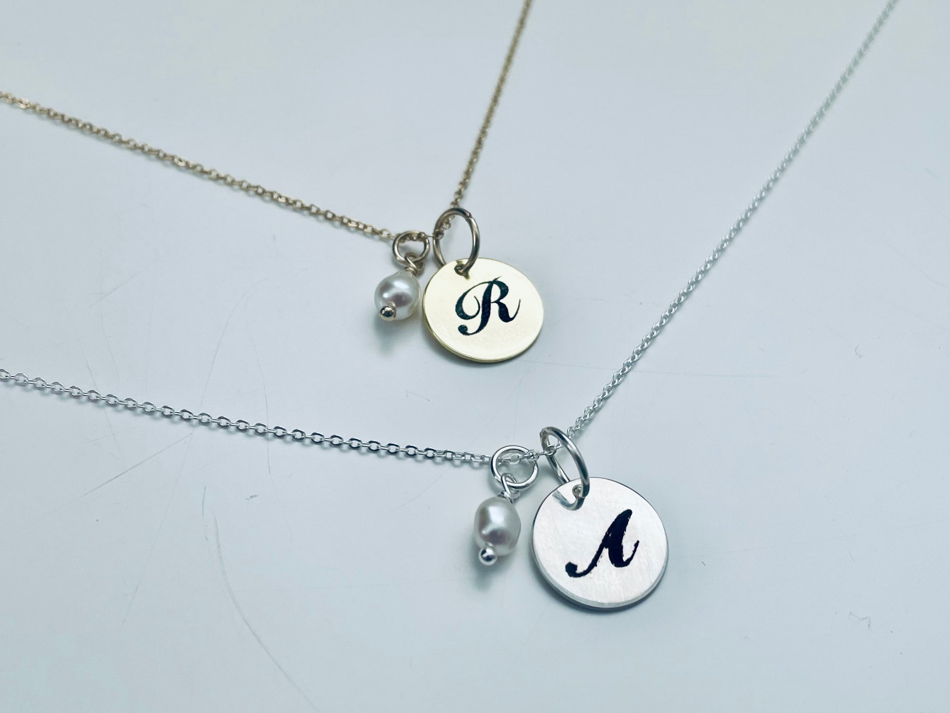 Above is a 5-6mm white keshi freshwater pearl with a 12mm personalised alphabet disc (in 925 silver or gold vermeil) set on either 14kt gold filled or sterling silver chain. The necklace length is approximately 40cm. These necklaces are bespoke and made to order. Please leave a note upon checkout as to what letters (up to 8) you would like to have engraved. You can also leave the disc blank if you wish.