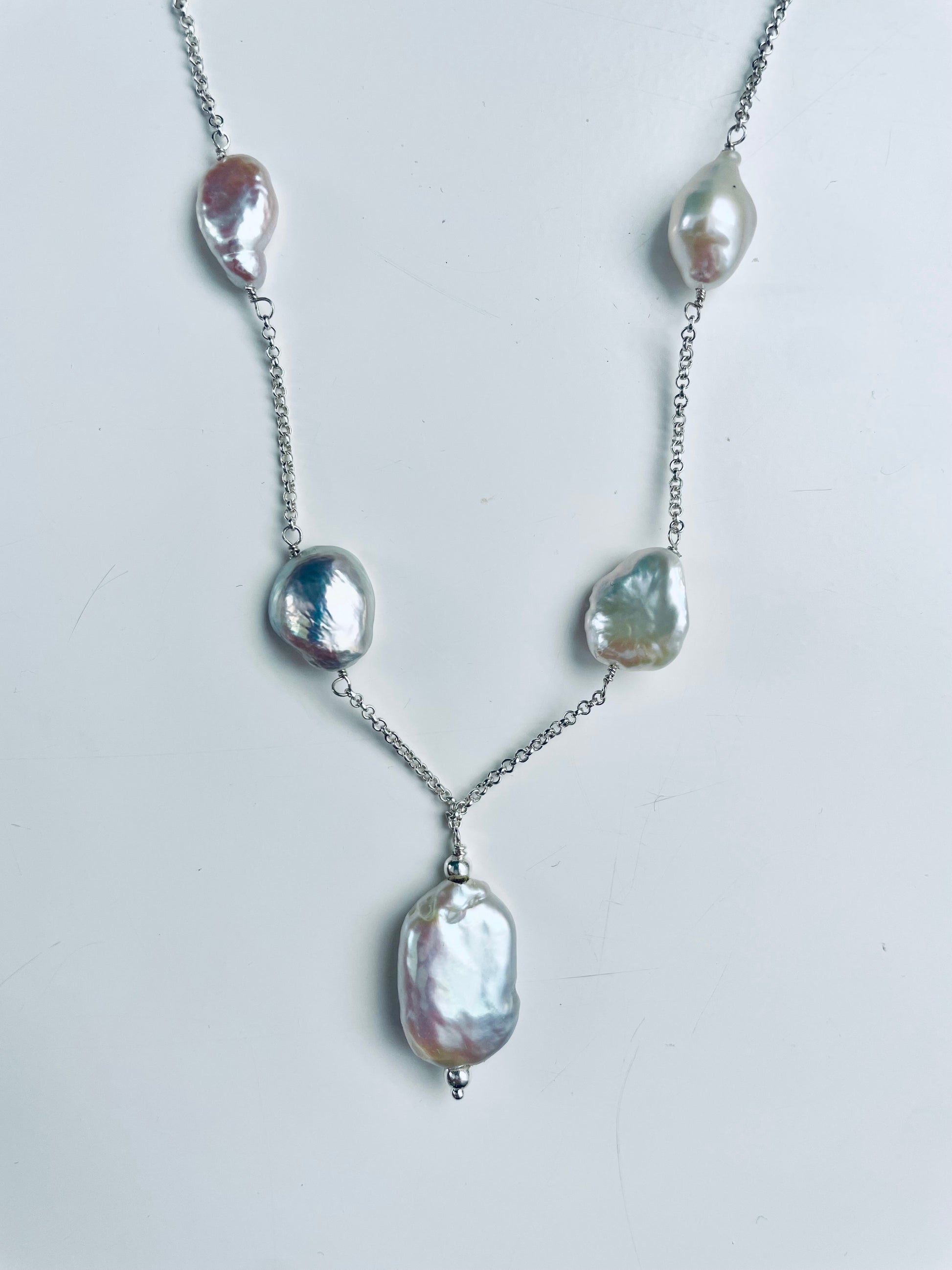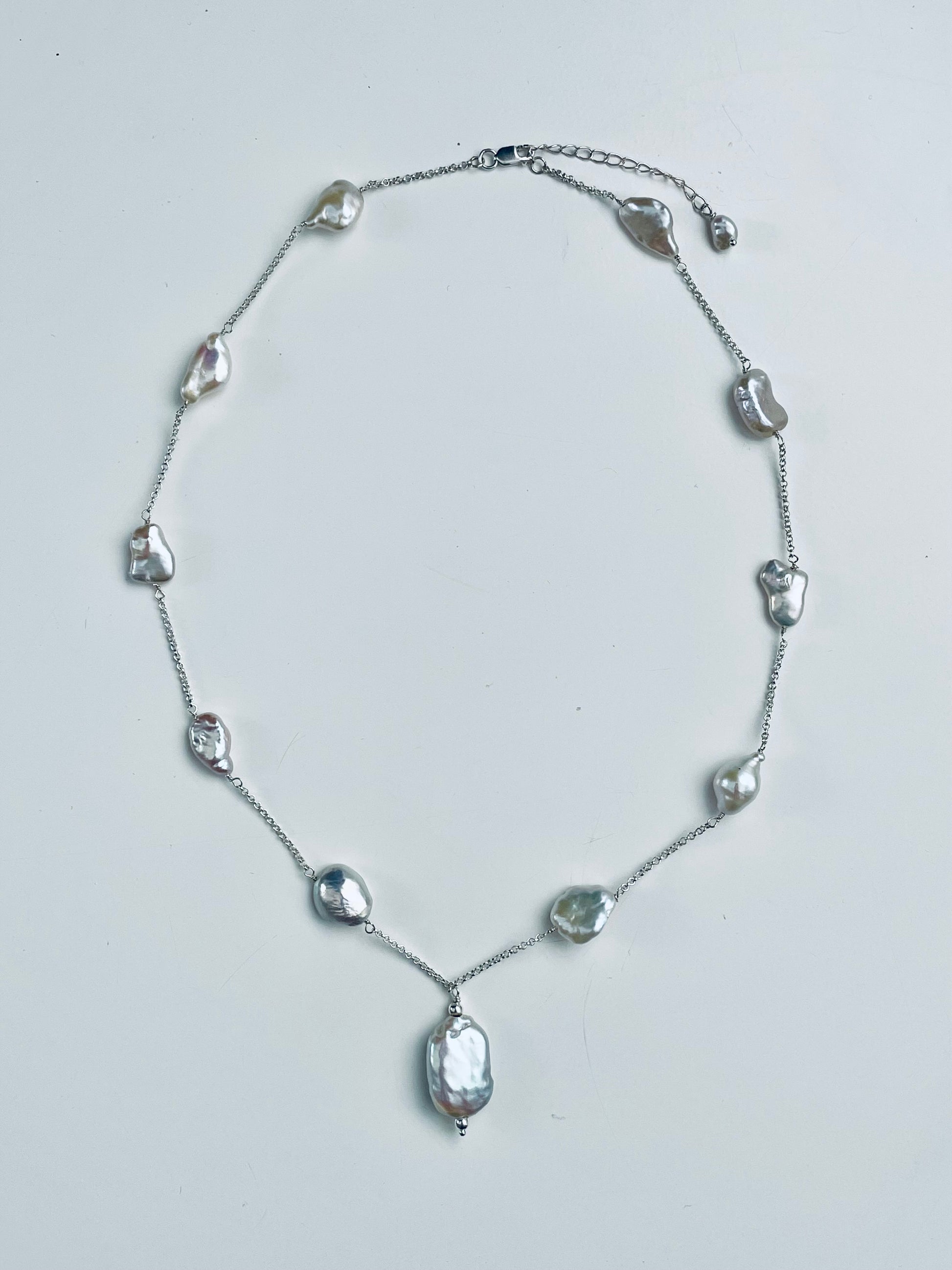 Above are three 5-10mm white keshi freshwater pearls with a single harlequin rectangle baroque pearl set on either a 925 sterling silver or 14kt gold filled necklace. The necklace length is 45cm