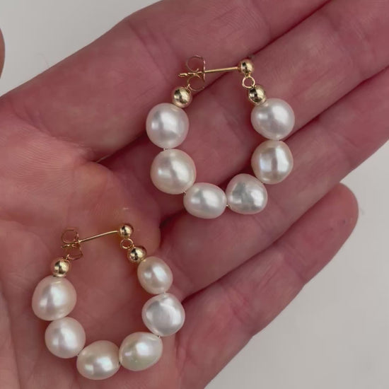 Above are 7mm freshwater white pearls set on either sterling silver or 14k Gold Filled wire. The diameter of the earrings are approximately 20 - 25mm. These are bespoke and made to order. All earrings are sold as a pair, and single earrings are not available for purchase. The pearls may vary between each pair as they are a natural, organic product.