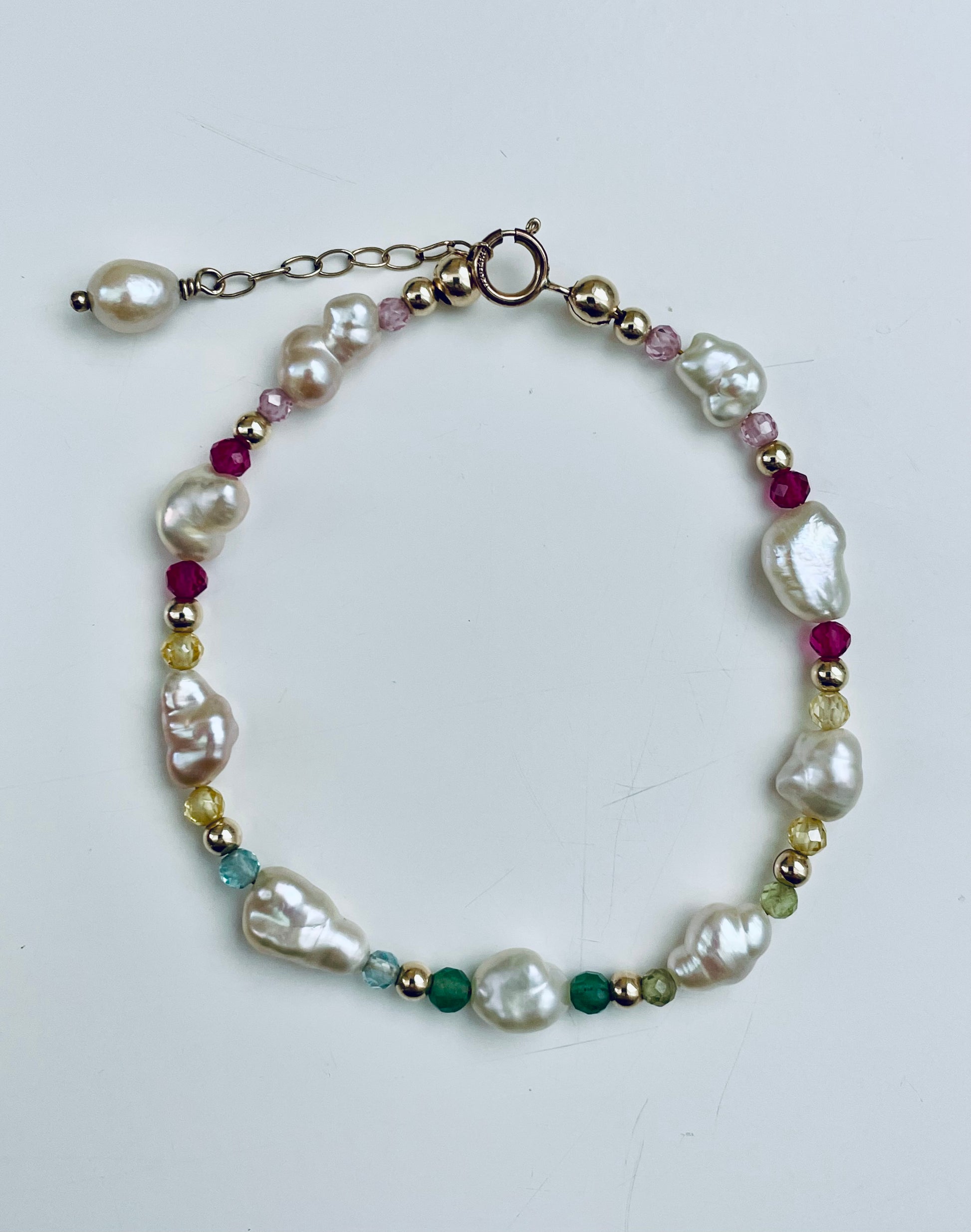 Above are 5-7mm white freshwater Keshi pearls set with either 925 sterling silver or 14kt gold filled findings and semi precious crystals. The bracelet is 17.5cm in length.