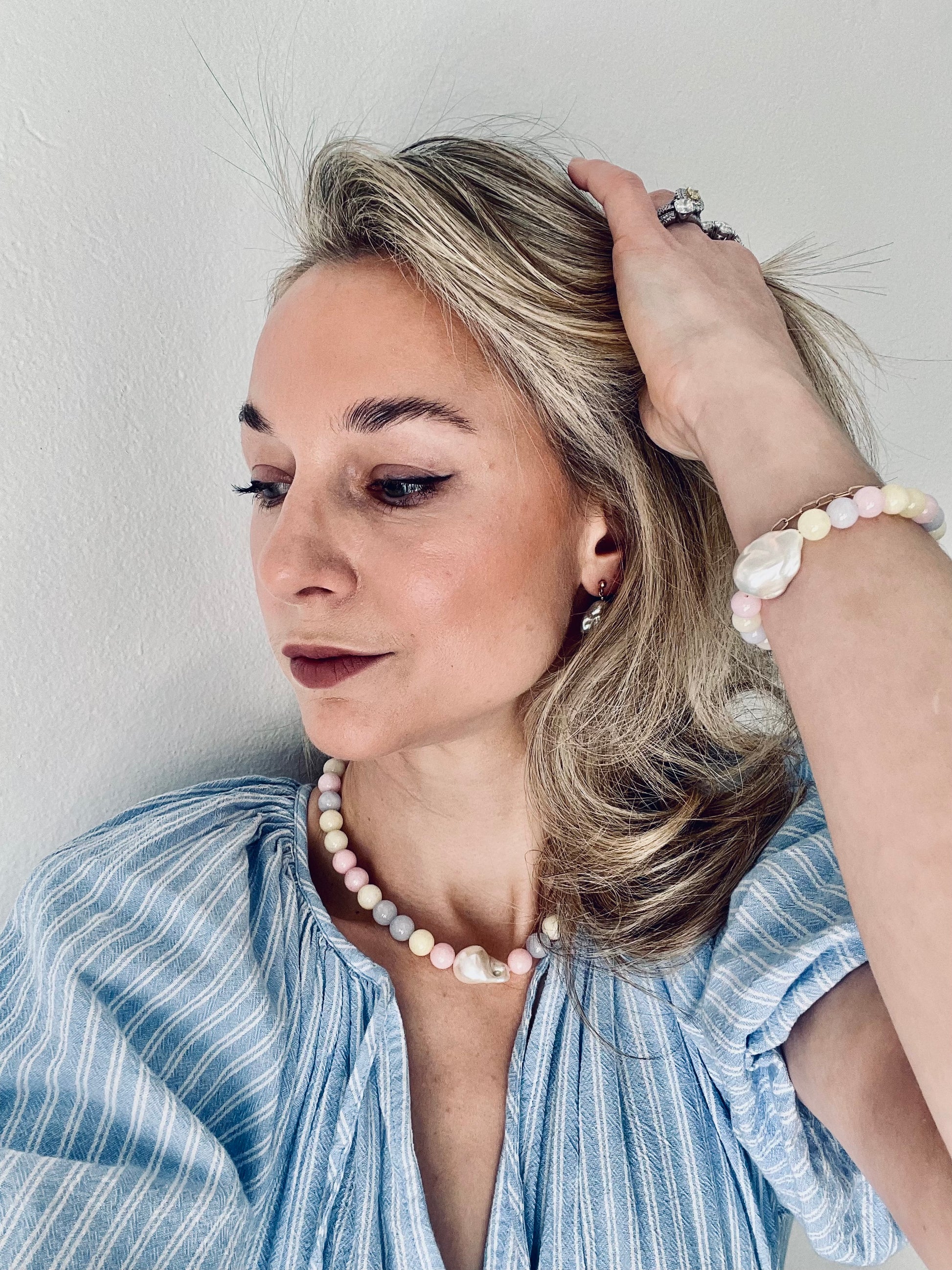 Above are 8mm mixed morganites stones with a 16-19mm white giant Flameball Pearl with either sterling silver or 14k Gold Filled fittings. The bracelet 17-18cm long with a 3cm extension. These are bespoke and made to order.