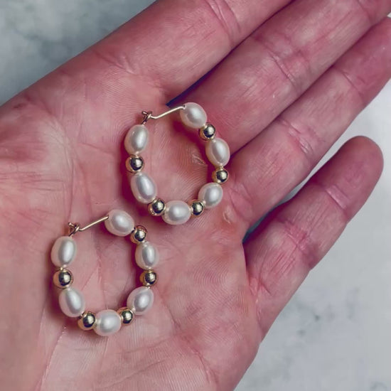 Above are 6-7mm freshwater white pearls set on 14kt gold filled wire. The diameter of the earrings is approximately 30mm. These are bespoke and made to order. All earrings are sold as a pair, and single earrings are not available for purchase. The pearls may vary between each pair as they are a natural, organic product.