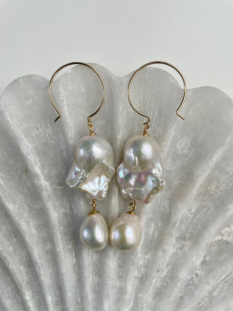 Above are 18-20mm Flameball and 12-13mm white Edison freshwater pearls set on either 14kt gold filled or sterling silver handcrafted hooks.