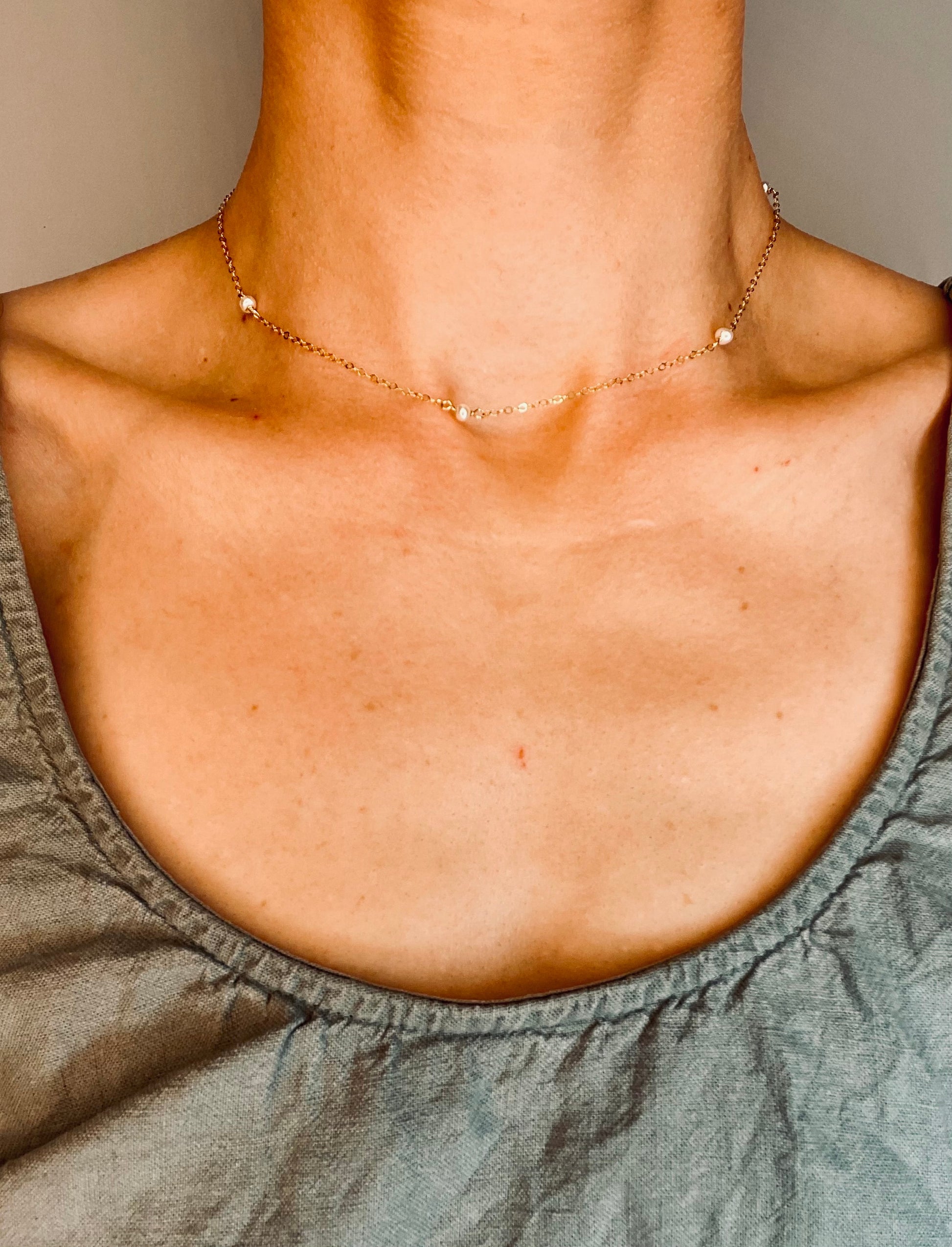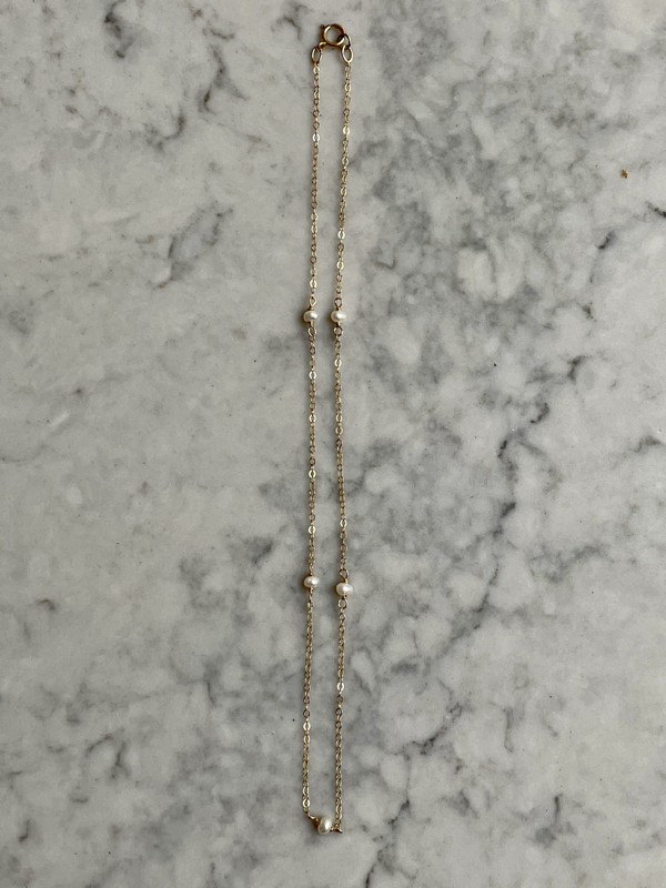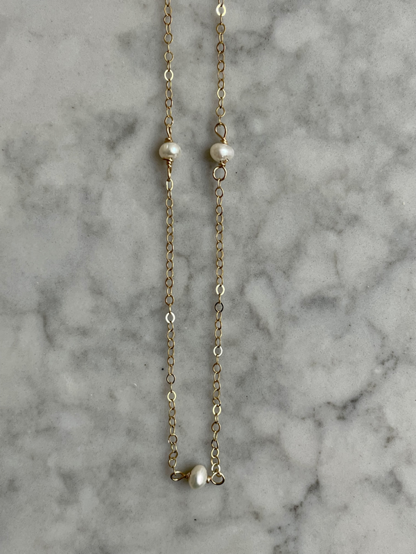 Above are 3-4mm baroque freshwater white pearls set on on either sterling silver or 14k Gold Filled chain. The necklace length is approximately 38cm. These necklaces are bespoke and made to order.