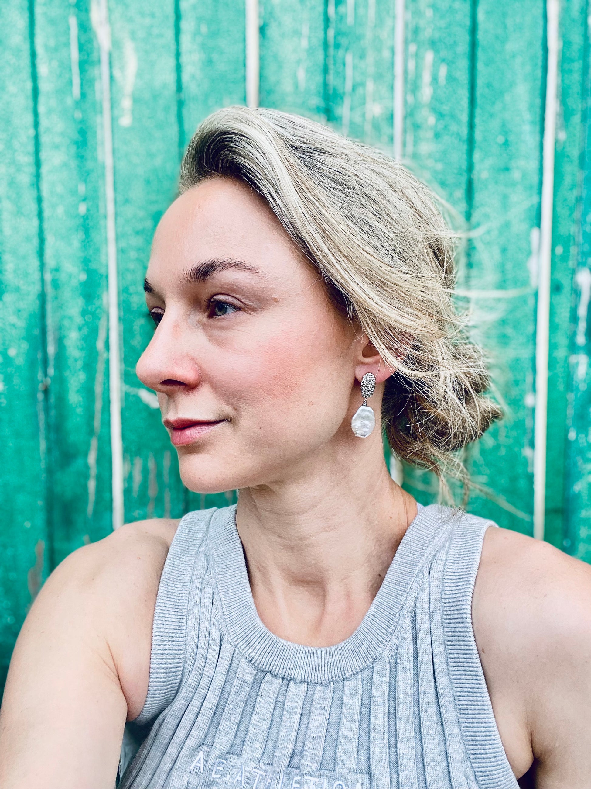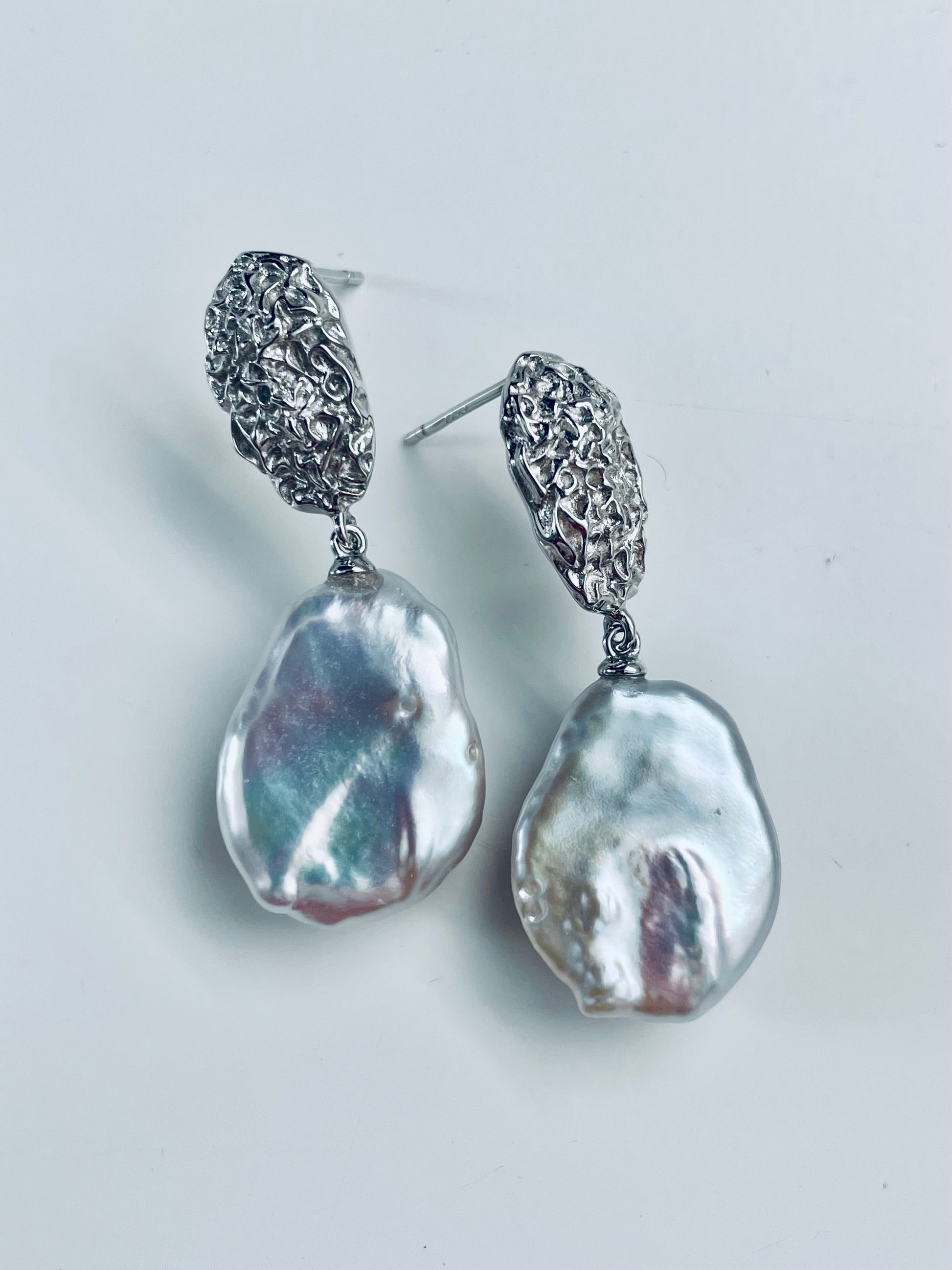 Above are 13-14mm white tear drop freshwater pearls set on sterling silver studs.