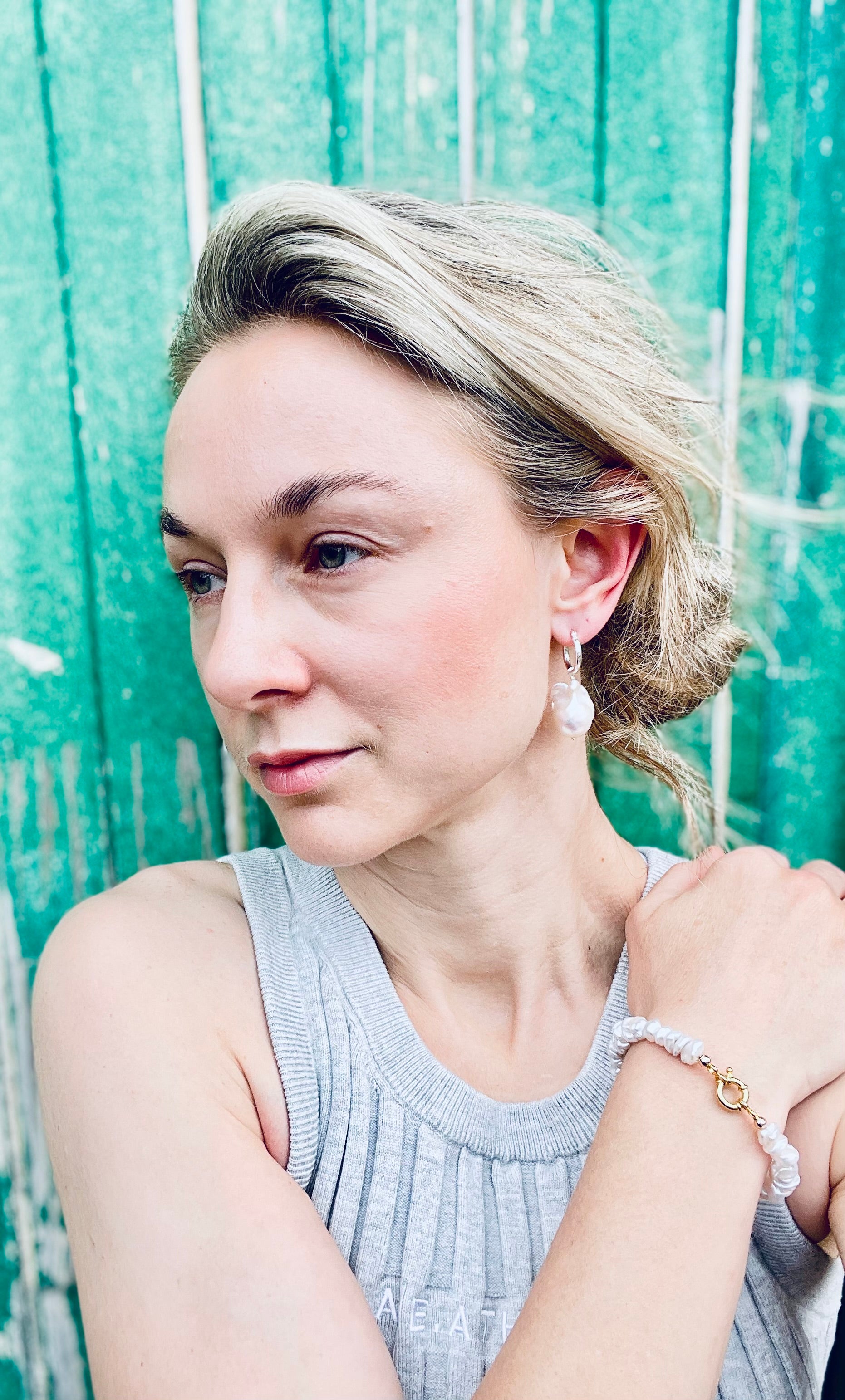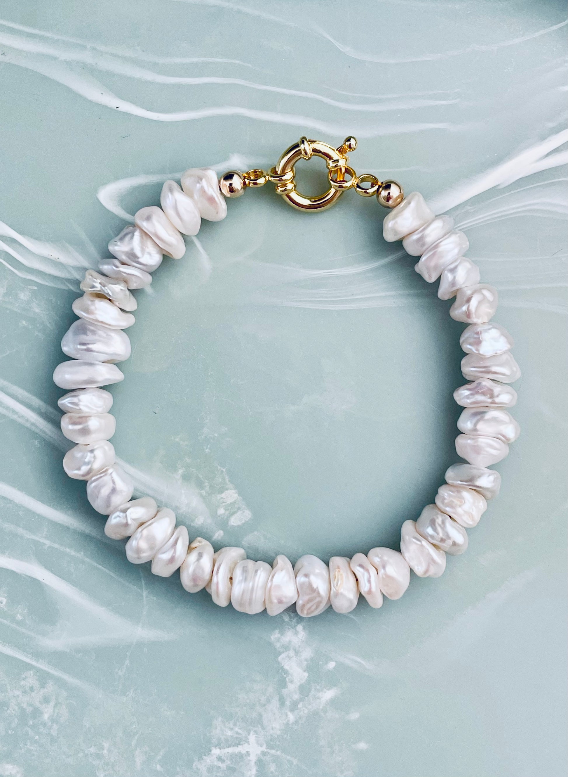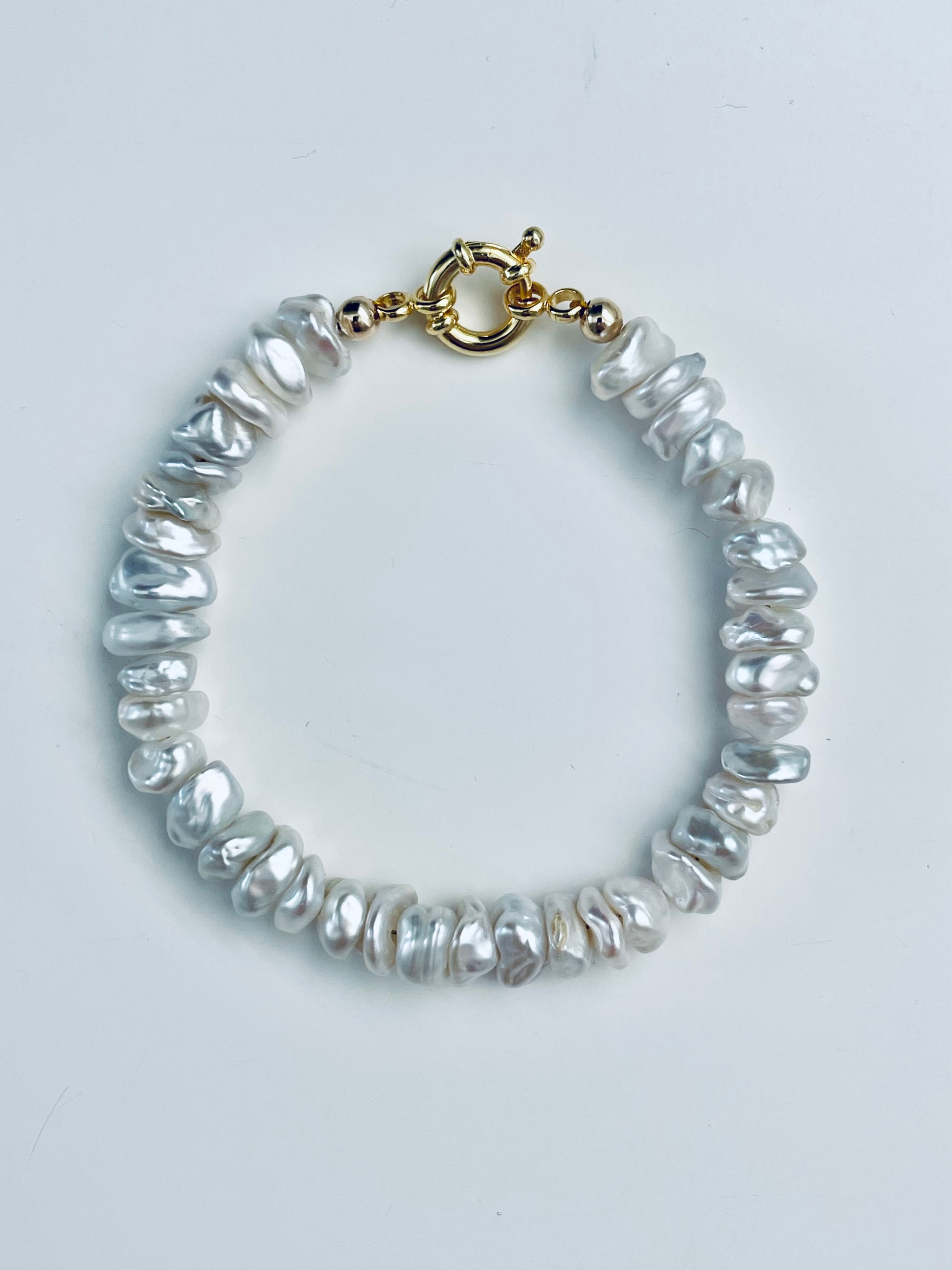 Above are 9-10mm Keshi white pearls set with either sterling silver or 14k Gold vermeil hardware. The bracelet length is approximately 18cm. These are bespoke and made to order. If you require a different size - please contact us.